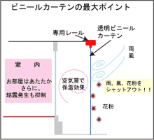 | 透明ビニールカーテンをベランダに取り付けることにより、外部からの視線をカット。さらに、冬場の防寒用としてお使いいただけます。寒さを防ぐだけでなく、透明ビニールなので、お部屋に光も取り入れOK |